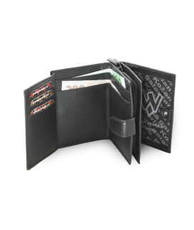 2 Fächer für Banknoten, 6 Taschen für Kreditkarten, 1 Innentasche, doppelte Reißverschlusstasche für Münzen und 2 separate transparente Taschen für Ausweisdokumente.