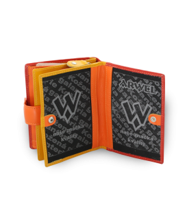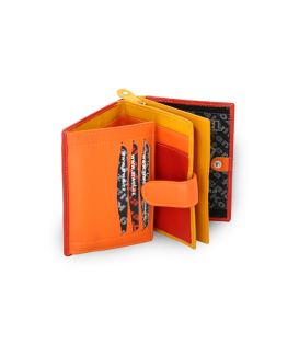 Lederafarbe: Rot mit orangefarbenem Akzent. Geldbörseninneres besteht aus Rot, Orange und Gelb