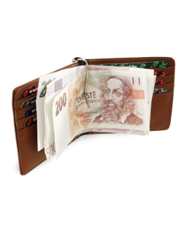 Gummiband zum Sichern von Banknoten, 8 Kreditkartenfächer, 2 Innentaschen und eine Außentasche für Münzen. Braune Nähte.