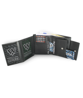 Klappdesign, 2 Fächer für Banknoten, 1 Münztasche, 9 Steckplätze für Kreditkarten, 5 Innentaschen und 3 transparente Taschen für persönliche Dokumente.