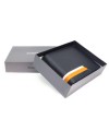 2 Fächer für Banknoten, eine Klappentasche für Münzen, 7 Taschen für Zahlungskarten oder Dokumente, 1 transparentes Fenster, 1 Rückentasche.