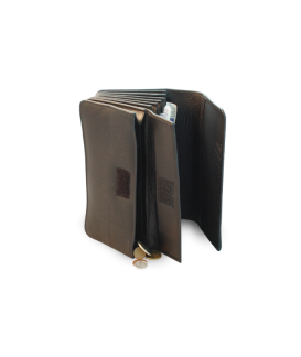 Accordion-shaped design with the ability to expand up to 24 cm, 7 compartments for banknotes, 1 zip pocket and 1 flip pocket for coins, 1 transparent pocket.